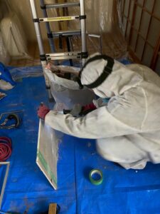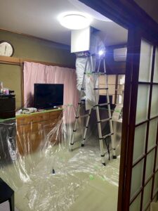 作る際に、木くずなどの粉塵が家具などに付着しないよう、ビニールで養生してあります。